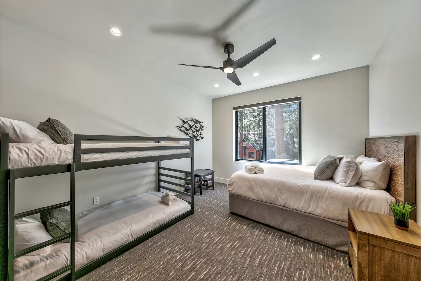 A bright, spacious shared suite with one queen bed and a twin bunk — perfect for guests who enjoy community and comfort. Large windows fill the room with Tahoe light, and a nearby shared bathroom adds convenience. Cozy, modern, and ideal for connection.